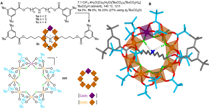 In a typical example of a hybrid organic-inorganic rotaxane synthesis (Figure 1A), a thread is reacted with a 7:1 molar ratio of Cr(III):Co(II) ions in the form of chromium(III) fluoride (CrF3.4H2O) and a cobalt(II) pivalate salt ([Co2(H2O)(tBuCO2)4(tBuCO2H)4]), with pivalic acid as the solvent, at 140 °C for 12 hours. The [2]rotaxane is formed in 23% yield, remarkably efficient for what is essentially a 33 component assembly process (each metal-ligand bond is dynamic under the reaction conditions).