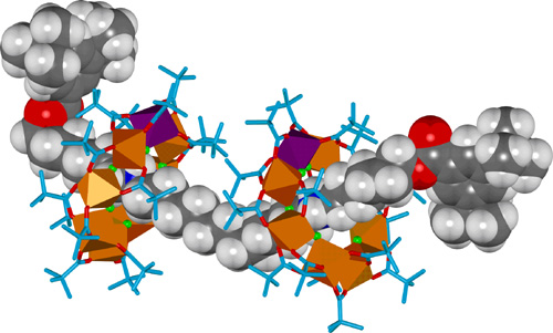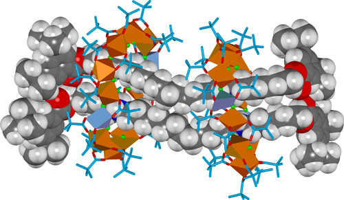 The tetravalency of carbon and its ability to form covalent bonds with itself and other elements are the cornerstones of organic chemistry, enabling large and complex (in terms of structure, function and dynamics) carbon-based molecules to be constructed. The electronic configurations and multivalency of metals and other inorganic elements, on the other hand, can impart diverse and useful electronic, magnetic, catalytic and other chemical and physical properties on molecular level structures. A team of chemists at the University of Manchester and the University of Edinburgh have now described[1] the first discrete[2] rotaxane molecules in which inorganic and organic components are linked together mechanically at the molecular level. An essentially inorganic wheel is assembled around a linear organic axle terminated with bulky ‘stoppers’ to form a hybrid rotaxane structure with dynamic properties that hitherto have been the preserve of organic molecules, such as the large amplitude thermal movement of the macrocycle up and down the axle (a ‘molecular shuttle’[3]), a motion of interest for synthetic molecular machine systems[4]. The threaded molecular architecture also ensures that the electronic, magnetic and paramagnetic characteristics of the heterometallic nuclear cages, which are part of a family of inorganic clusters viewed as potential components for qubits for quantum information processing[5], are intrinsically associated with—and can potentially influence and be influenced by—the organic portion of the structure.