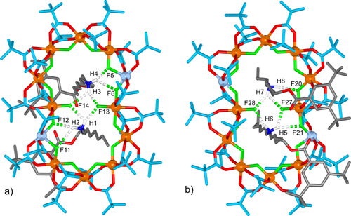 The different coordination requirements of copper(II) (five coordinate) compared to cobalt(II) (six coordinate) causes some enforced changes in the ligand arrangement for the heterometallic wheel, and in the [4]rotaxane two of the fourteen fluoride ligands are bound to only one metal ion rather than bridging two. These two singly-coordinated fluoride anions play a central role as hydrogen bond acceptors in the intercomponent binding motifs of the [4]rotaxane in the solid state, each being involved in bifurcated hydrogen bonding to two ammonium groups on different threads (Figure 4).