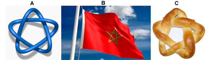 Figure 3. Pentafoil knots. The pentafoil knot has symbolic significance in many ancient and modern cultures and religions (as does its two-dimensional projection, the pentagram) and features as the central emblem on the present-day flags of both Morocco and Ethiopia. A, the topology of a pentafoil knot (five crossing points). B, the Moroccan flag. C, a pentafoil knot in edible form!