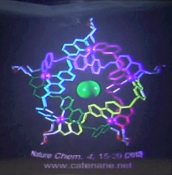 To mark the synthesis of the first molecular pentafoil knot, the Leigh group teamed up with Holoxica, an innovative start-up company based in the Scottish Microelectronics Centre specializing in holograms, to produce the first hologram of a small-molecule X-ray crystal structure (Figure 6). The hologram is a great way to appreciate the three dimensional structure and topology of the molecular knot.