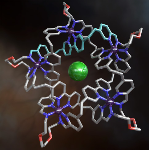 Figure 2. A molecular star is born! The X-ray crystal structure of a 160-atom-loop molecular pentafoil knot featuring iron ions (shown in purple), oxygen atoms (red), nitrogen atoms (dark blue), carbon atoms (shown in metallic grey, with one of the building blocks shown in light blue) and a single chloride ion (green) at the centre of the structure. [‘A Synthetic Molecular Pentafoil Knot’ Jean-François Ayme, Jonathan E. Beves, David A. Leigh, Roy T. McBurney, Kari Rissanen and David Schultz, Nature Chem. 4, 15-20 (2012)]. Image credit: Robert W. McGregor (www.mcgregorfineart.com).