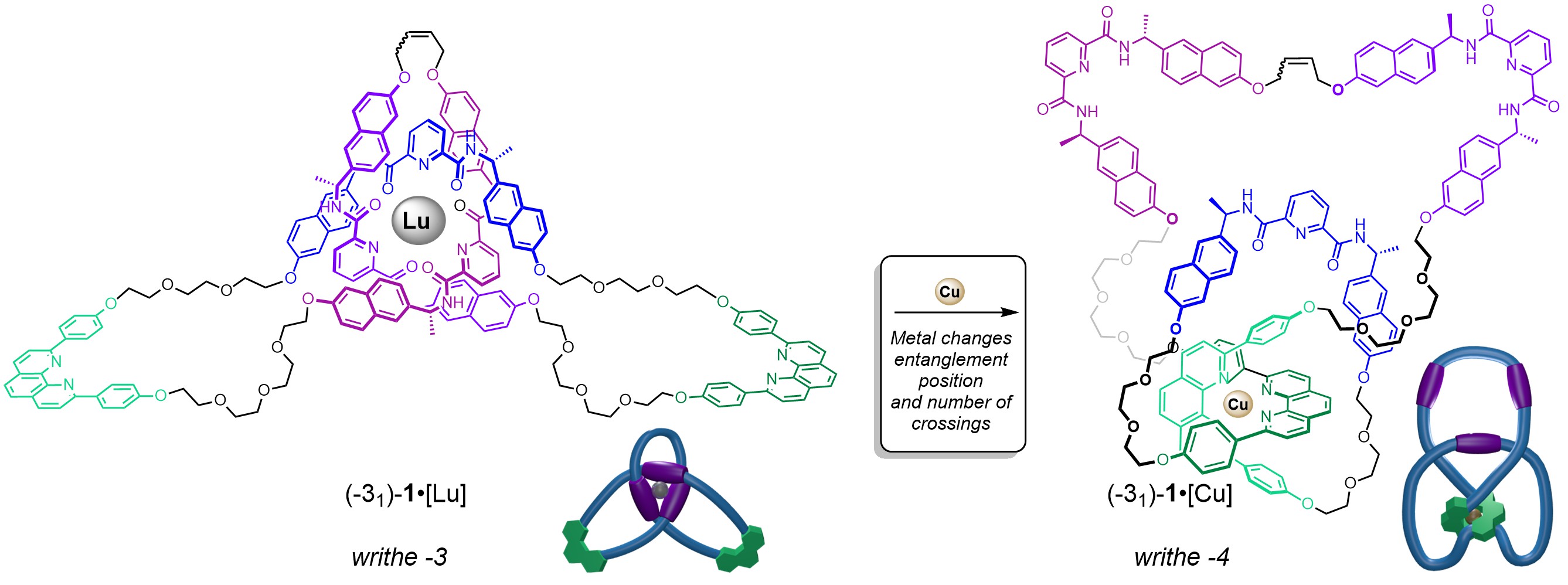 Figure 3. Binding different metal ions changes the position of an entanglement within a molecular knot.