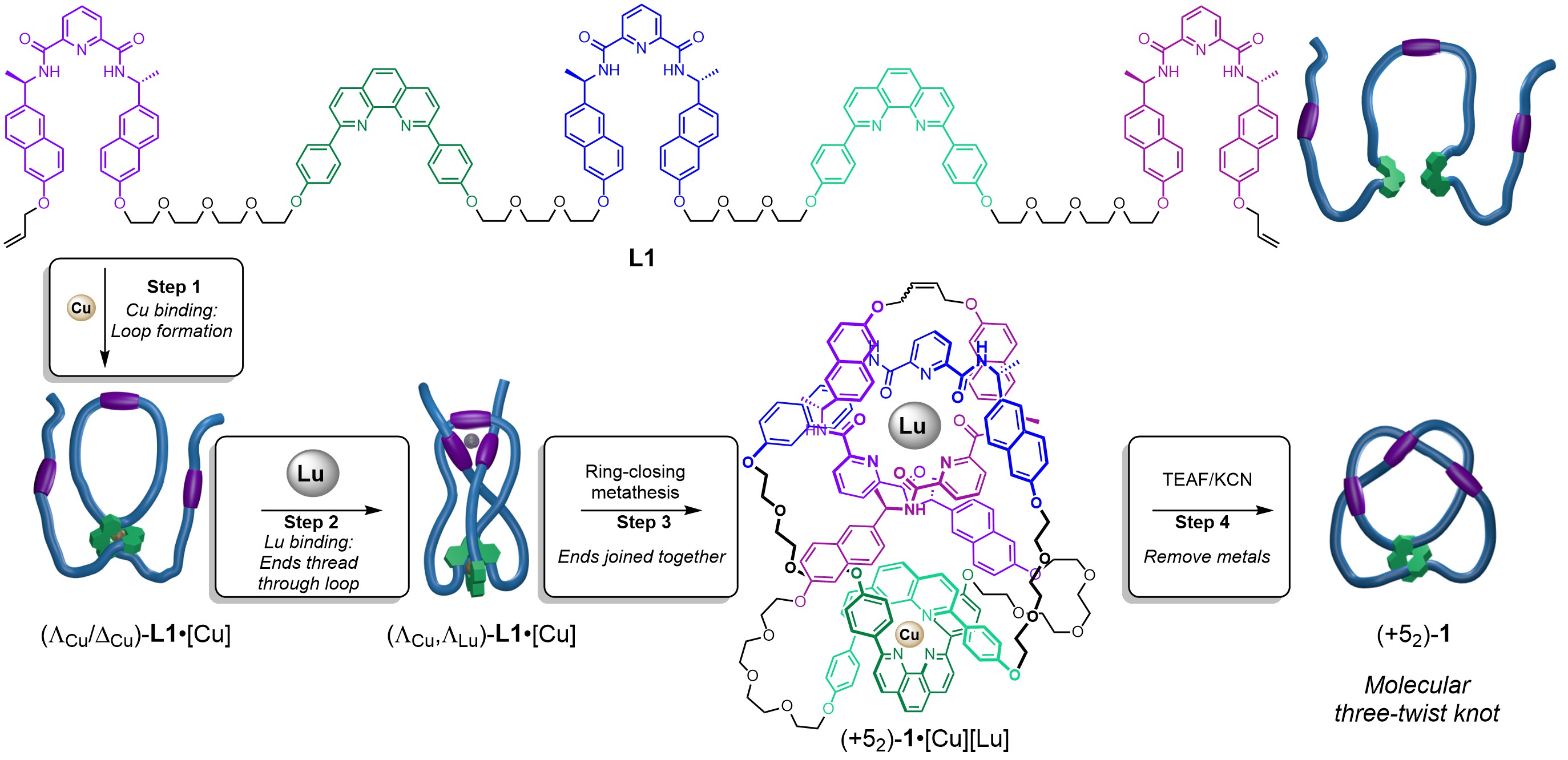 If no metal ions are present, cyclisation of ligand L1 forms an unentangled macrocycle (a 01 unknot, Video 1) upon ring-closing olefin metathesis. When foldamer L1 is treated only with LuIII ions, the strand folds into a trefoil (31) knot — a knot with three crossings (Video 2).[11]