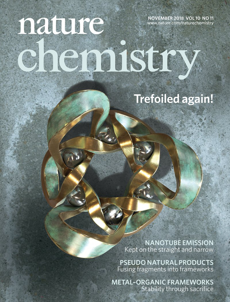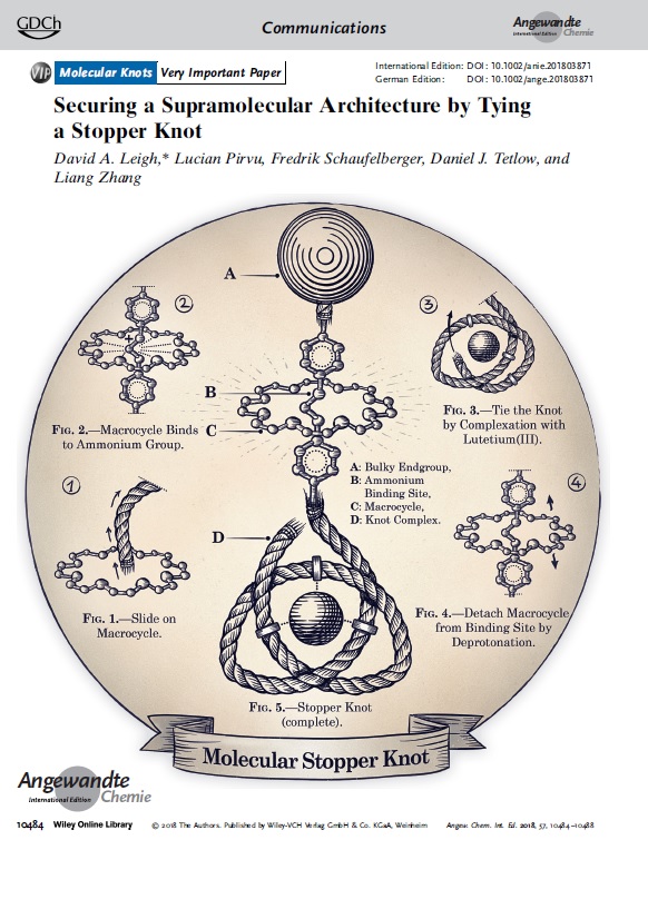 - ‘Stereoselective synthesis of a composite knot with nine crossings’, L Zhang, A J Stephens, A L Nussbaumer, J-F Lemonnier, P Jurček, I J Vitorica-Yrezabal and D A Leigh, Nature Chem, 10, 1083-1088 (2018). Featured on the cover of Nat Chem.