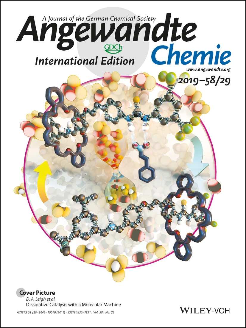 - ‘Dissipative catalysis with a molecular machine’, C Biagini, S D P Fielden, D A Leigh, F Schaufelberger, S Di Stefano and D Thomas, Angew Chem Int Ed, 58, 9876-9880 (2019). [Hot Paper] Featured on the cover of Angew Chem Int Ed (image credit: Dr. Anna Tanczos, SciComm Studios).