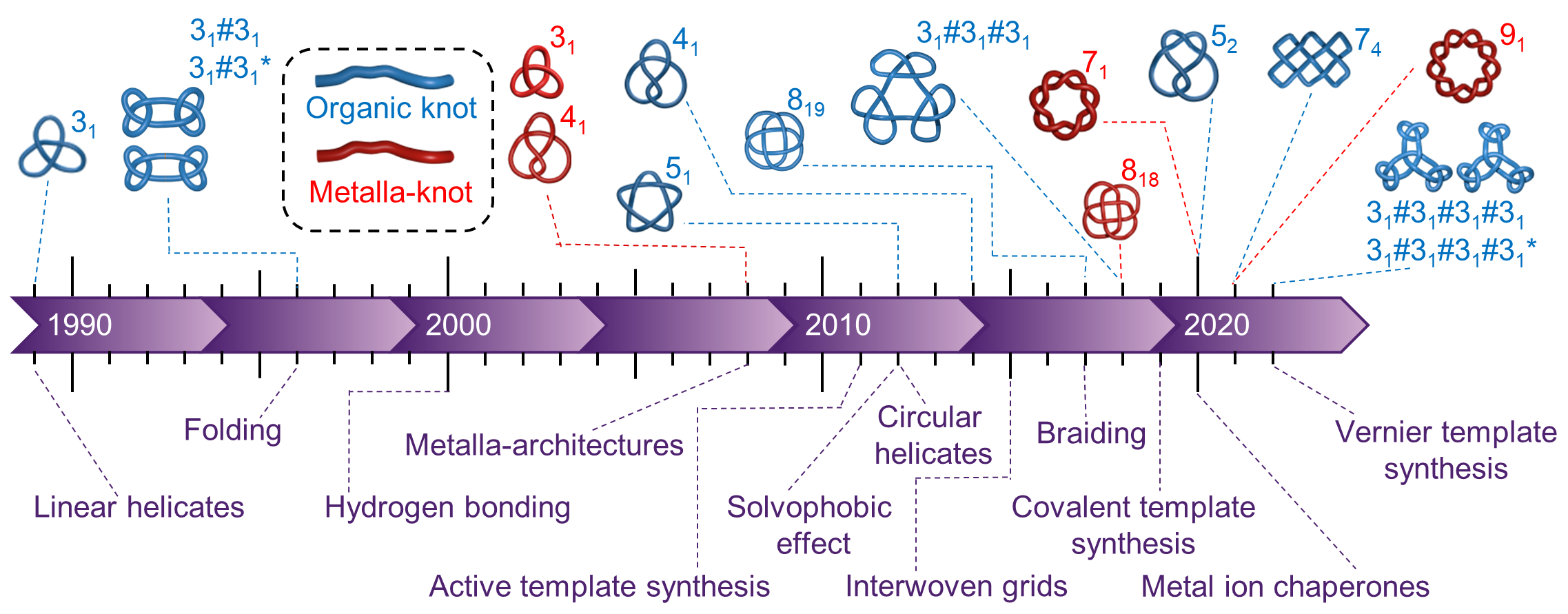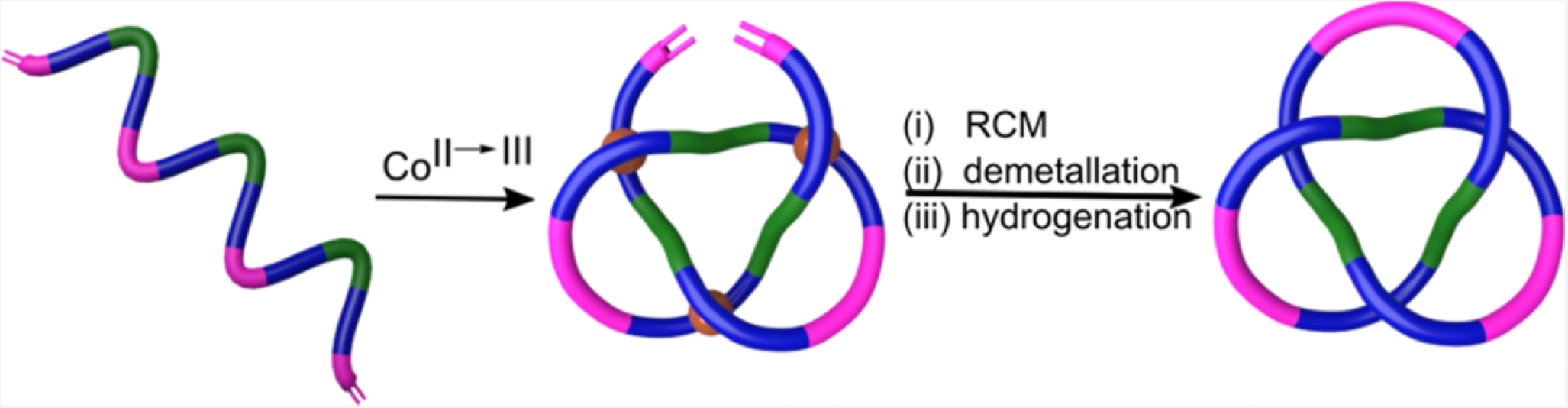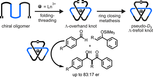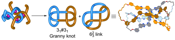 [For highlights of this paper see, ‘What tangled webs we weave’ (N&Vs), E E Fenlon, Nature Chem, 10 Sept 2018; ‘Chemists tie most complex molecular knot to date’, Chem & Eng News, 10 Sept 2018; ‘The world’s most complex molecular knot ties up a record’, Nature, 10 Sept 2018; ‘Chemists weave granny and triple trefoil knots’, Chem World, 11 Sept 2018; ‘Researchers create most tangled interlocked molecule ever’, Phys.org, 12 Sept 2018; ‘Der kleinste Dreifachknoten der Welt (in German)’, Spektrum.de, 13 Sept 2018; ‘Kemikere skaber molekyle med ni knuder (in Danish)’, Ingeniøren, 13 Sept 2018; ‘Molecules of the Year 2018’, Chem & Eng News, 96(49), 40-41 (2018)]