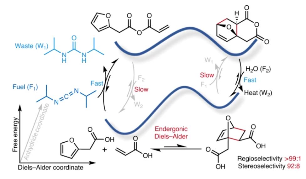 [For highlights of this paper see, 'Synthesis goes uphill', (N&Vs), M Stasi, H Soria-Carrera, J Boekhoven, Nat Synth, 3, 673–674 (2024); 'Pushing the ball uphill: energetically unfavourable Diels-Alder reaction driven by chemical fuel', Chem World, 19 March 2024;]